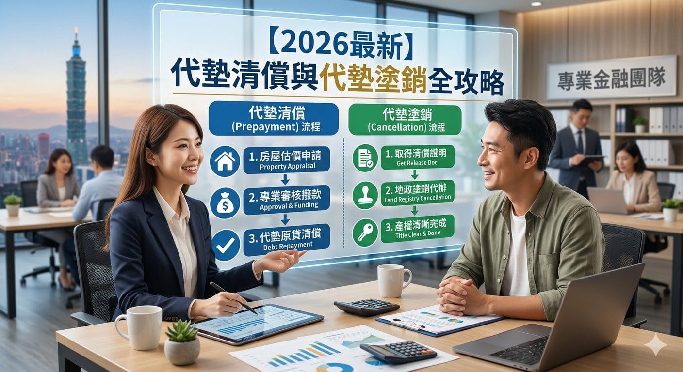 【2026最新】代墊清償與代墊塗銷全攻略 破解民間設定、查封撤封與繼承難題是什麼? 處理不動產買賣、轉貸或繼承,卻卡在「前手抵押權未塗銷」或「欠稅未繳」? 這不是一般的資金急用,而是需要專業「產權障礙清除」來解套。 🏦 經濟部合法立案 | ⚡ 2000萬內當天撥款 | 📋 流程透明 | 📞 免費諮詢 📋 本文目錄 代墊清償與代墊塗銷是什麼? 5 大產權卡關地雷,代墊服務如何精準救援? 代墊款的利率與期限 為什麼不動產解套首選鼎浚國際理財? …